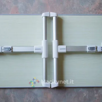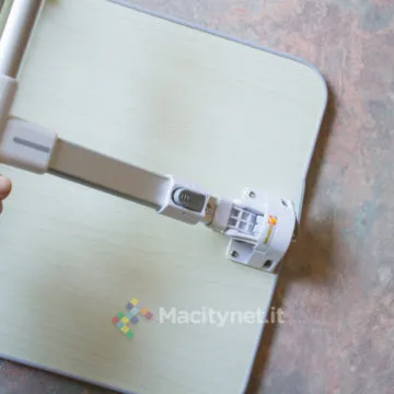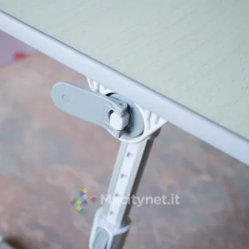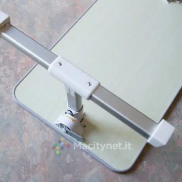 Il tavolino è praticamente già montato e pronto all’uso. L’unica cosa da fare è incastrare la sporgenza in plastica al piano bucando la pellicola trasparente a protezione dei due fori: in questo modo si avrà un solido aiuto nel caso di utilizzo con un computer portatile, che non scivolerà neanche alla massima inclinazione del tavolo.