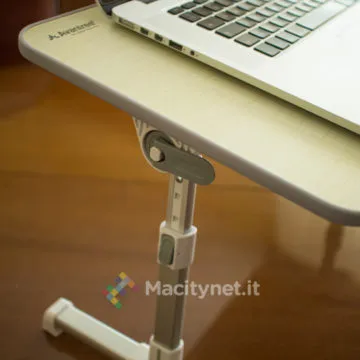 E’ leggero e poco invasivo quando non si utilizza, tanto che può essere ripiegato e nascosto anche dietro al divano, in più l’altezza è regolabile, dimostrandosi performante anche per chi passa troppo tempo seduto alla scrivania in quanto permette di continuare ad usare il computer anche alzandosi in piedi.