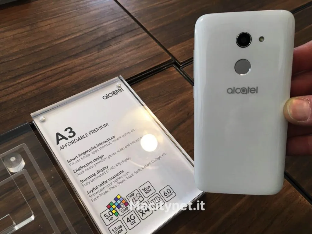 Il secondo smartphone Alcatel presente in fiera è A3, uno smartphone pensato per i giovani, ad un prezzo competitivo. Alcatel A3 propone un profilo sottile, caratterizzato da rifiniture glossy con effetto 3D e una cornice in metallo, con un tasto di accensione rifinito con un pattern zigrinato. A3 è dotato di un sensore per il riconoscimento delle impronte digitali, e per una maggiore sicurezza offre la funzione Private Mode, che protegge i dati più sensibili. Oltre a sbloccare il telefono con sfruttando il Touch ID, è possibile anche utilizzare le impronte delle cinque dita affinché ciascuna lanci le cinque app preferite dall’utente, anche quando il telefono è bloccato.