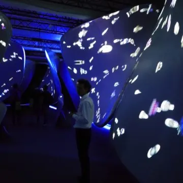Il pubblico è invitato all’ingresso a scegliere interattivamente una forma per il terminale e inviarlo in un doppio display dalle sembianze organiche in cui l’oggetto virtuale creato dal visitatore viene a trovarsi come una nuova forma di vita in grado di interagire con suoi pari… In una seconda sala le dimostrazioni delle capacità di interazione con un mondo a 360 gradi ed un grande schermo affascinano i visitatori che possono toccare con mano i due modelli di S8, la telecamera 360, il visore con controller e la postazione che trasforma lo smartphone nel motore di un portatile con tastiera.