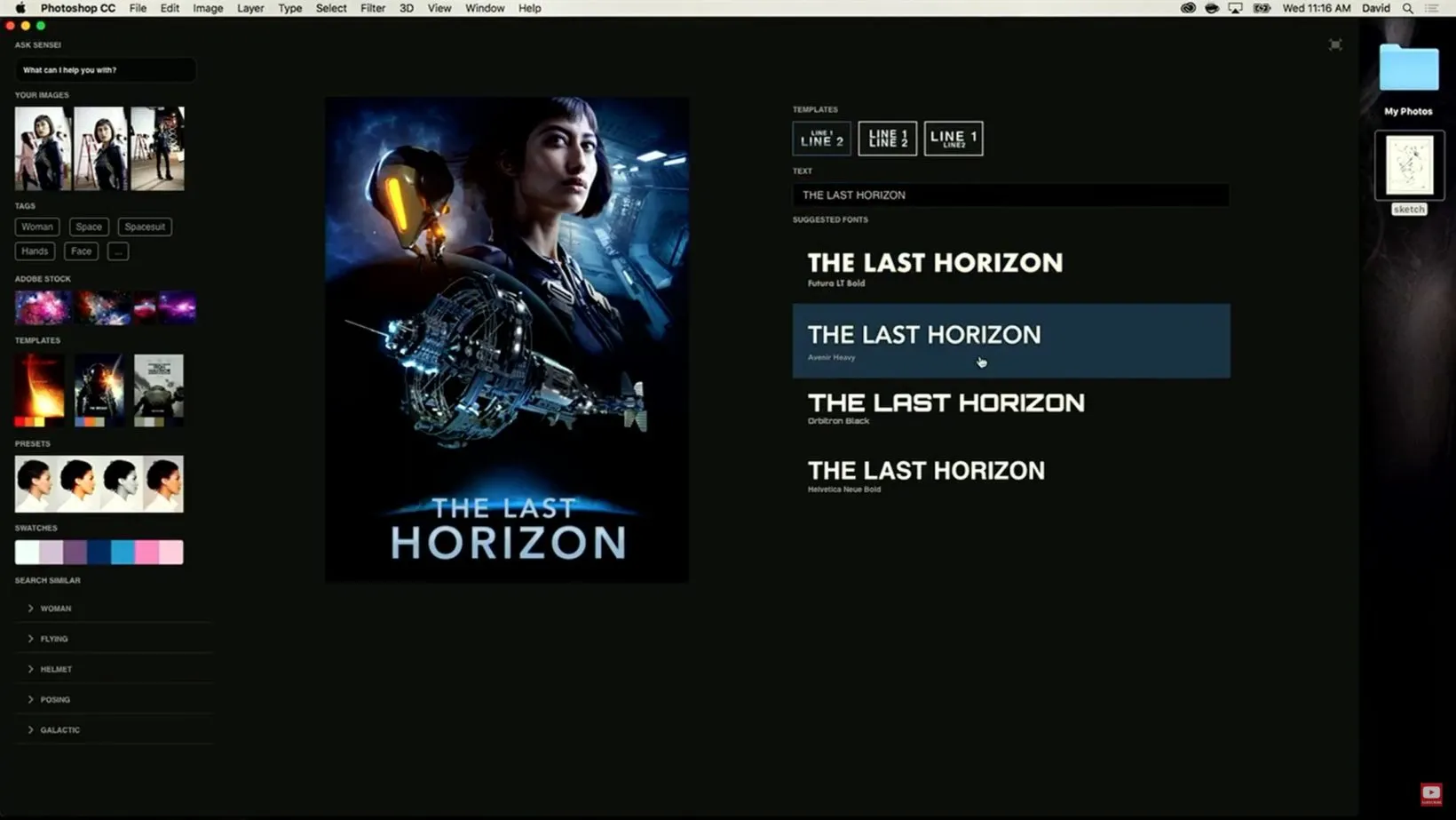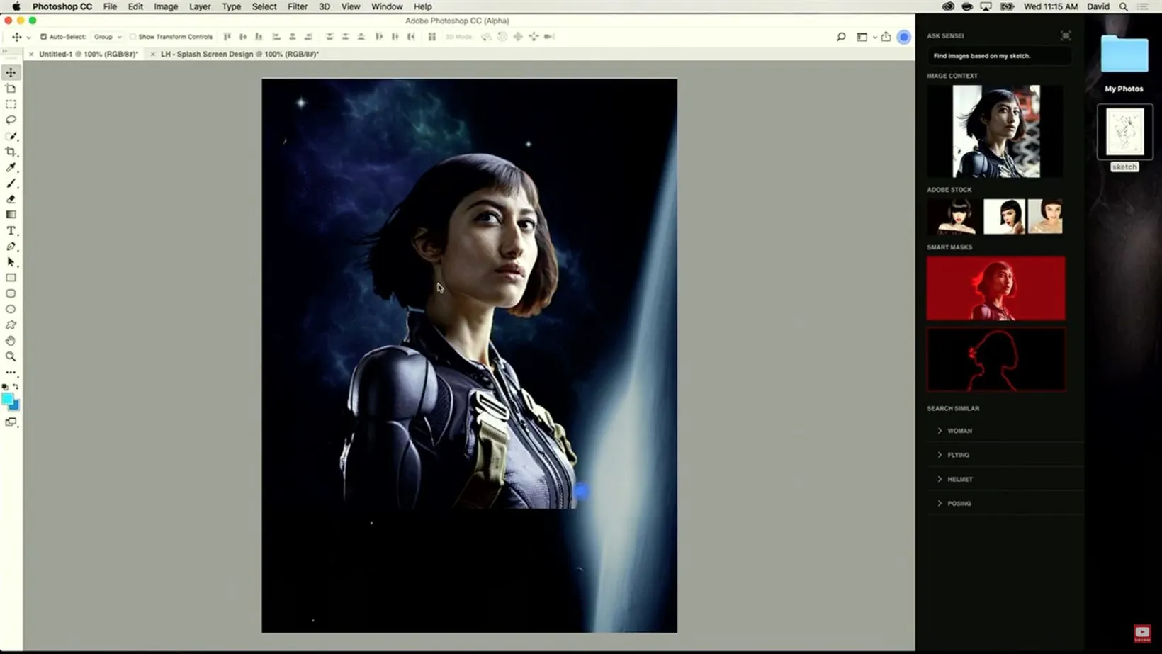 La dimostrazione che ha riguardato Photoshop è stata molto interessante, incluse le funzioni che hanno dimostrato la possibilità di usare la voce e il linguaggio naturale per chiedere aiuto all’intelligenza artificiale. David Nuescheler, Adobe Fellow e Vice Presidente Enterprise Technology della multinazionale di San Jose, ha caricato uno schizzo in una pagina bianca di Photoshpp CC, un personaggio femminile abbozzato in una composizione di fantasia a tema spaziale. Automaticamente Sensei, rappresentato a schermo con un puntino blu che ricorda assistenti tipo Siri e Cortana, ha individuato vari elementi del disegno, tra cui i tag “donna”, “volo”, “galattico”, “posa”, “astronave”, “casco”. Nuescheler ha chiesto poi a Sensei di trovare delle immagini legate al suo bozzetto nella libreria Adobe Stock. Sono state individuate varie foto del cosmo.
