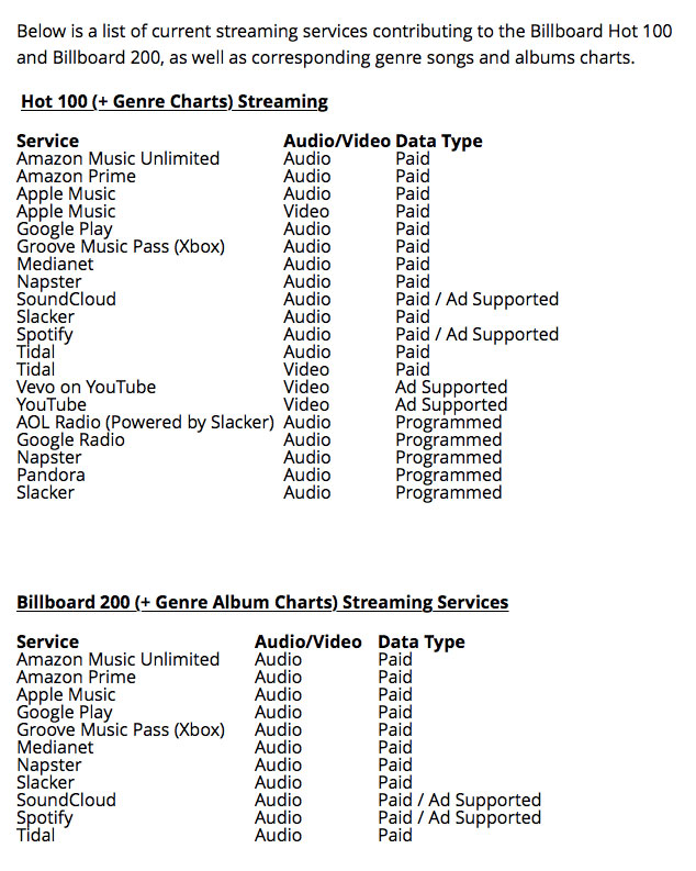 “Il nostro obiettivo” è riportato in un articolo online, “è di rappresentare in modo accurato e imparziale” vita e morte di un successo musicale. La Billboard Hot 100 è stilata sulla base dei dati di vendita calcolati non solo sugli album venduti “fisicamente”, ma anche sulle vendite digitali, sui passaggi in radio, sui numeri di streaming in abbonamento (Apple Music, Spotify, ecc.) e dalle visualizzazioni settimanali dei video su YouTube. Dal prossimo anno le canzoni ascoltate sui servizi a pagamento avranno un maggiore peso rispetto a quelli ascoltate con offerte gratuite o con intermezzi pubblicitari.