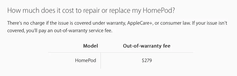Riparare HomePod costerà quasi quanto acquistarlo nuova. Potrebbe sembrare inutile acquistare la garanzia AppleCare+ per una periferica che sta ferma sopra un mobile, ma forse è il caso di valutarla ugualmente, soprattutto per chi ha gatti o cani che scorrazzano per casa.