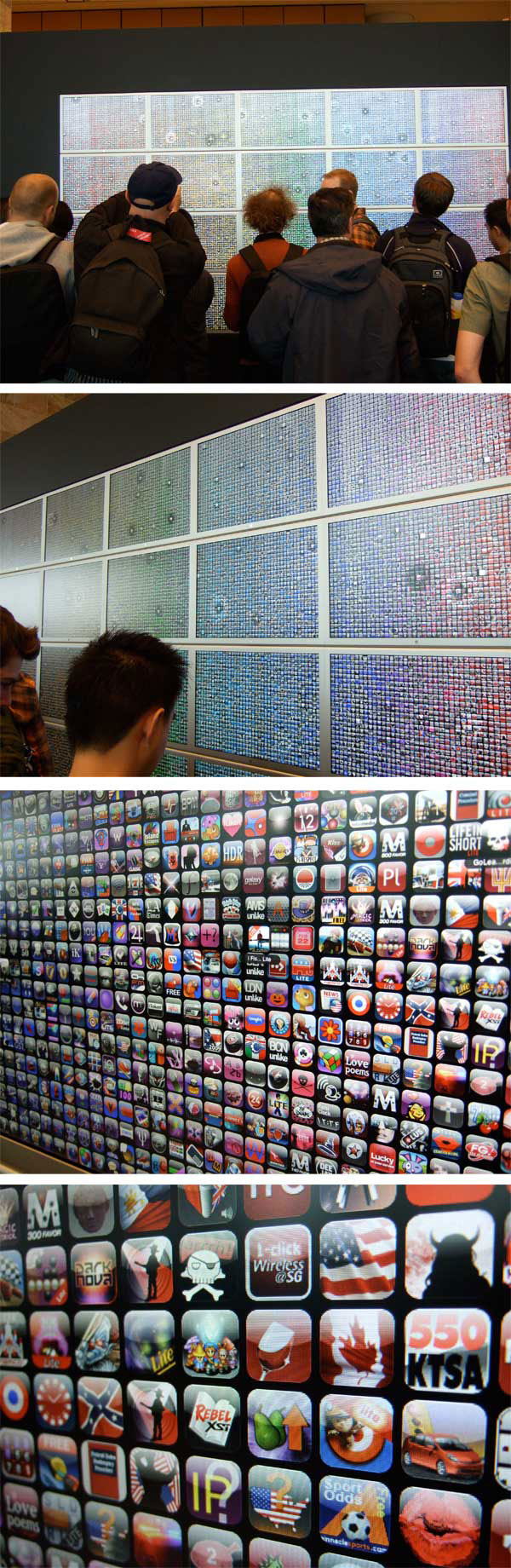 Inevitabile il passo dei cronisti di Macity per capire la ragione di tanto interesse e la funzione della strana installazione e la scoperta: quello schermo mostrava tutte e 50mila le applicazioni dell’App Store raffigurate con le loro icone. Il muro veniva “piegato” con una sorta di cerchio concentrico quando un’applicazione veniva acquistata, di qui lo strano effetto sassolini nello stagno che si nota anche nelle nostre foto.