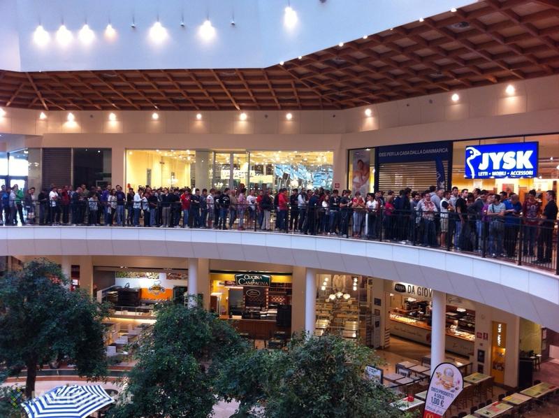 Questa mattina alle 7.40 erano già 150 le persone appostate lungo la galleria del centro commerciale: una fila ordinata che è cominciata per i primi già nel pomeriggio di ieri. Il primo in fila è Alessandro Citton di Venezia, ricordiamo già primo in fila anche per l’inaugurazione dell’Apple Store di Bologna: Alessandro si è posizionato qui prima delle 14 di ieri. In seconda e terza posizione troviamo Oscar e Claudio Barresi di Torino, invece al quarto e quinto posto troviamo Marco e Matteo che si sono appostati solo pochi minuti dopo, alle 14.15 circa sempre di ieri.