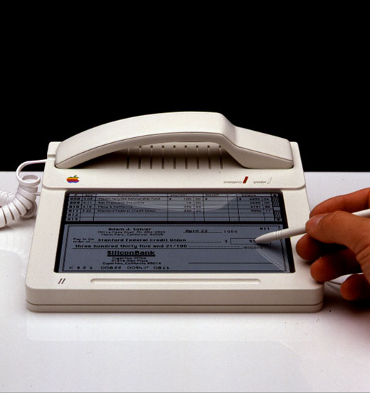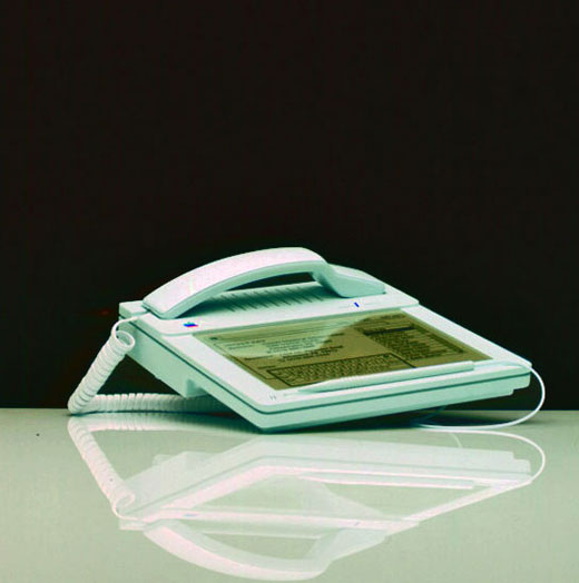 Quello che si può dedurre dalle foto è davvero poco, ma quel poco appare sicuramente interessante e curiosamente convergente con le idee di fondo di iPhone. Ad esempio lo schermo è un “paleo-touch” con penna stilo, come si usava a quei tempi. In una immagine si vede persino una tastiera virtuale. In altre foto, a lasciare intendere che la fantasia Esslinger non mancava, si vedono cornette telefoniche integrate in stampanti e persino tastierini telefonici con “tasto-mela”.