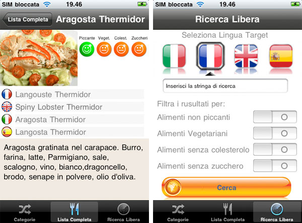 L’applicazione sviluppata da Marco De Girolamo è un database che comprende 1500 piatti internazionali, divisi in 19 categorie, tradotti in 4 lingue, completi di ingredienti, descrizione e foto. Sono presenti 3 tab di ricerca, incluso uno full-text abilitato sui 4 dizionari. Sono state implementate funzionalità  per includere o escludere con un solo click le pietanze vegetariane, piccanti, ad alto contenuto di colesterolo e di zuccheri, informazioni che saranno comunque sempre visibili sulla scheda di dettaglio.