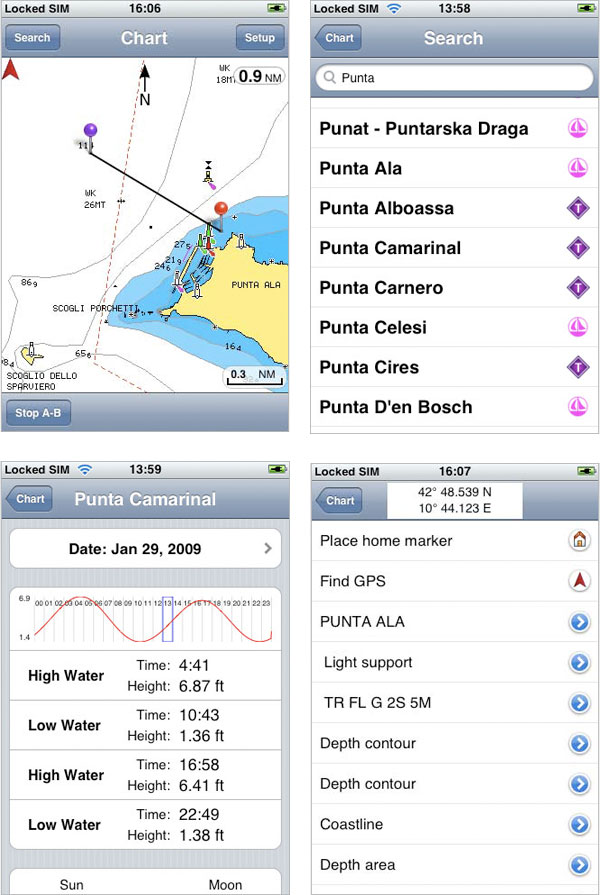 Gli applicativi Navionics creati per iPhone trasformano lo smartphone della Mela in un vero e proprio navigatore satellitare GPS utile per i professionisti e gli appassionati del mare. Grazie alle mappe dettagliate e in alta risoluzione possiamo sempre sapere la nostra posizione, ingrandire e ridurre la visuale nel classico stile iPhone per visualizzare così l’intero tragitto o i dettagli ravvicinati della zona circostante. Oltre a tutte le informazioni e i servizi disponibili nei porti, incluso il numero di telefono che possiamo chiamare con un tap del dito, le cartografie Navionics visualizzano correnti e maree, punti di ancoraggio e relitti e molto altro ancora.