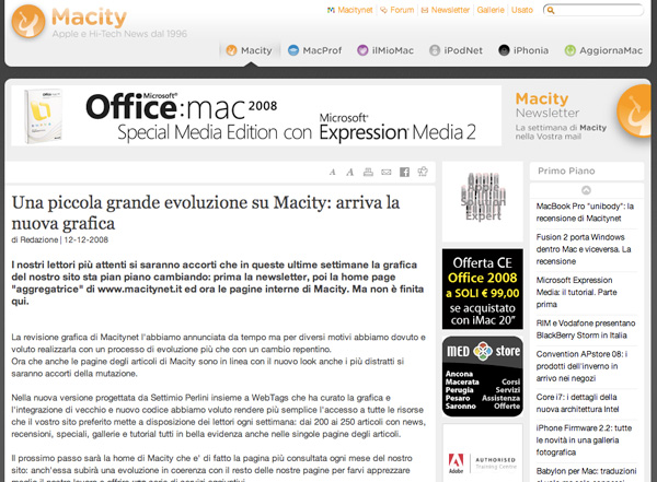 Ora oltre alle pagine degli articoli di Macity in linea con il nuovo look ci sono quelle interne di MacProf, AggiornaMac, ilmioMac e iPodnet.