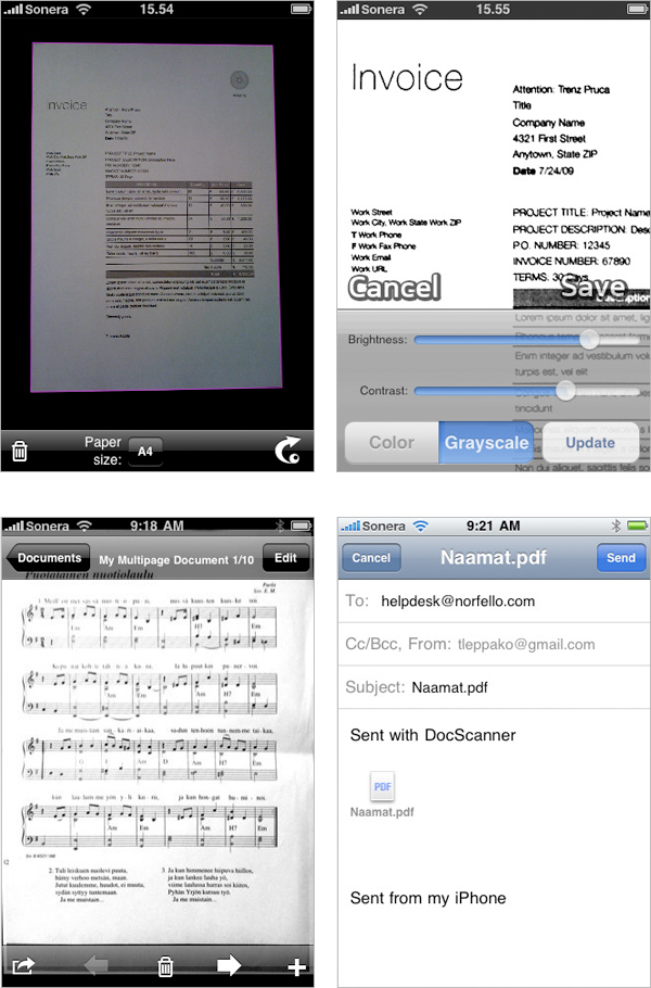 DocScanner trasforma iPhone in uno scanner tascabile per i documenti: per sfruttare gli automatismi del programma è sufficiente scattare la foto dei documenti su uno sfondo scuro. In questo modo il programma riconosce i bordi del foglio, dopo di che ritaglia il documento, ruota e corregge la prospettiva, infine migliora luminosità e contrasto senza alcun intervento da parte dell’utente. Le operazioni di trasformazione vengono eseguite direttamente su iPhone che così può essere utilizzato come scanner tascabile anche in assenza di collegamento al Web: i documenti possono essere memorizzati come file PDF e JPG per poi essere inviati anche via email quando il collegamento a Internet risulta disponibile.