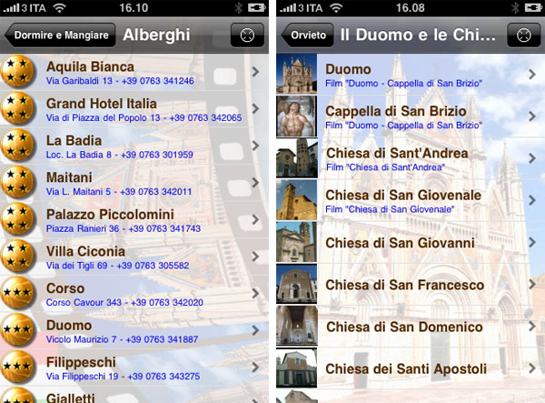 Il debutto avviene con una guida ad Orvieto, cittadina umbra di grande appeal turistico, artistico e culturale. Nell’applicazione ci si trovano 25 minuti di filmati realizzati appositamente, visibili attraversi l’apposito elenco oppure direttamente dalle pagine che li descrivono, un’ampia galleria fotografica con centinaia di immagini di tutti i luoghi, chiese e monumenti, la storia della città , una visita guidata e dettagliata a tutti i luoghi di interesse tra cui anche il duomo, monumento principe della città . Vengono trattate anche feste, folclore, artigianato, gastronomia con le ricette tipiche, i consigli per il viaggio, il soggiorno e la visita alla città , compresi numeri telefonici utili, indirizzi, siti Internet. Per il soggiorno sono presenti le principali strutture ricettive con descrizioni, indirizzi, telefoni, siti web e mail tutti cliccabili e localizzabili su una cartina geografica visionabile anche come mappa satellitare.