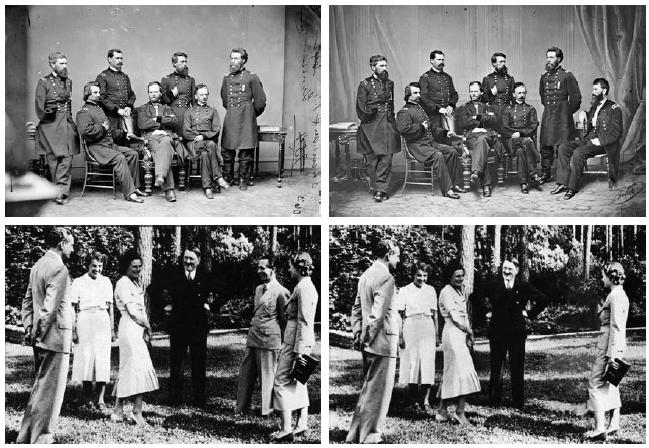 Nelle foto sopra due esempi di manipolazioni d’altri tempi: il comandante delle forze statunitensi Sherman posizionato tra i suoi generali, e Hitler con e senza Joseph Goebbels il ministro della Propaganda nel Terzo Reich.