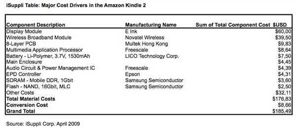 Kindle è un computer totalmente chiuso. Al suo confronto, l’iPhone sembra una macchina open source. Il cuore è la tecnologia E Ink del display, che consente risparmi energetici (le microsfere che sostituiscono i pixel consumano solo quando ruotano per aggiornare l’immagine, non a display fisso) costa ad Amazon più di tutto: ben 60 dollari. Altri 39,50 se ne vanno per il modulo wireless Novatel, mentre processore (Freescale) e batteria costano rispettivamente meno di nove e di otto dollari. Il fornitore di memoria è Samsung, sia per la ram che per quella di massa, pari a 2 Gigabyte (2,50 dollari). Ai costi ei materiali pari a 176 dollari si sommano i costi di assemblaggio, pari a meno di 9 dollari per apparecchio, arrivando al totale di 185,49 dollari.