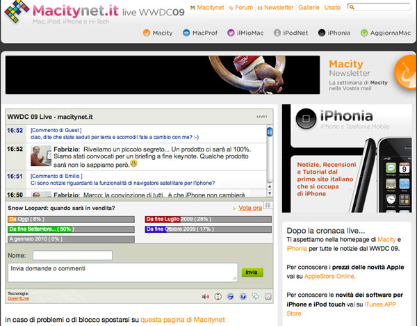 Un piacevole effetto audio che ricorda la svolta di una pagina cartacea richiama l’attenzione del lettore ogni volta che un nuovo post viene pubblicato online. Oltre ad offrire informazioni più velocemente, la nuova piattaforma per il blog live risulta utile per effettuare sondaggi tra i lettori, permette di postare commenti e pareri, infine risulta utile per approfondire dettagli e informazioni con collegamenti ipertestuali e immagini. La redazione di Macitynet spera che la novità sarà apprezzata dai lettori e …buon WWDC ’09!