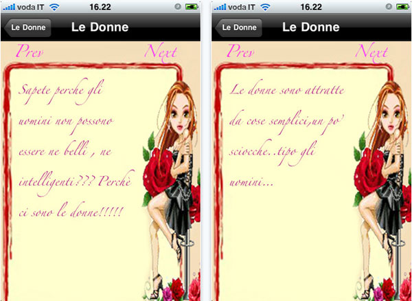 Sapete perché gli uomini non possono essere né belli né intelligenti? Semplice: perché ci sono le donne! Ecco un esempio delle 100 frasi incluse nel programma gratuito Le Donne per iPhone e touch. Motti di spirito, non-sense e luoghi comuni, 100 frasi da leggere o da raccontare sempre con il sorriso sulle labbra, per il misogino che c’è in noi ma anche per le signore con iPhone e touch disposte a sorridere sulle debolezze e le virtù del gentil sesso