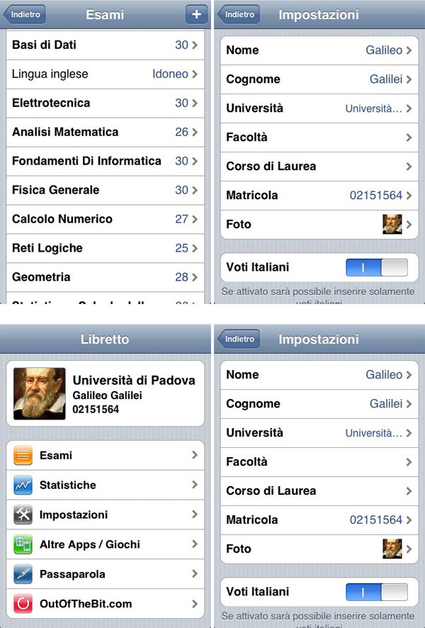 ‘€œOgni studente ha una costante nella sua vita universitaria: il libretto ‘€“ spiega Alessandro Motisi, sviluppatore e fondatore di OutOfTheBit ‘€“. Da lì passa la sua intera storia, da matricola a laureando Chi non fa i ‘€œconti’€ prima di ogni esame? Serve a sapere quale voto minimo accettare per no rovinarsi la media, per mettersi la coscienza a posto anche se non arriva il ‘€œ30’€, e forse a volte anche per esorcizzare la paura. E allora perché non fare tutto questo con l’€™aiuto del proprio iPhone o iPo Touch? Così è nata l’€™idea di Libretto. E una delle caratteristiche che abbiamo voluto aggiungere è l possibilità , una volta inserita una nuova materia, di comunicarlo agli amici, con un semplice click’€.