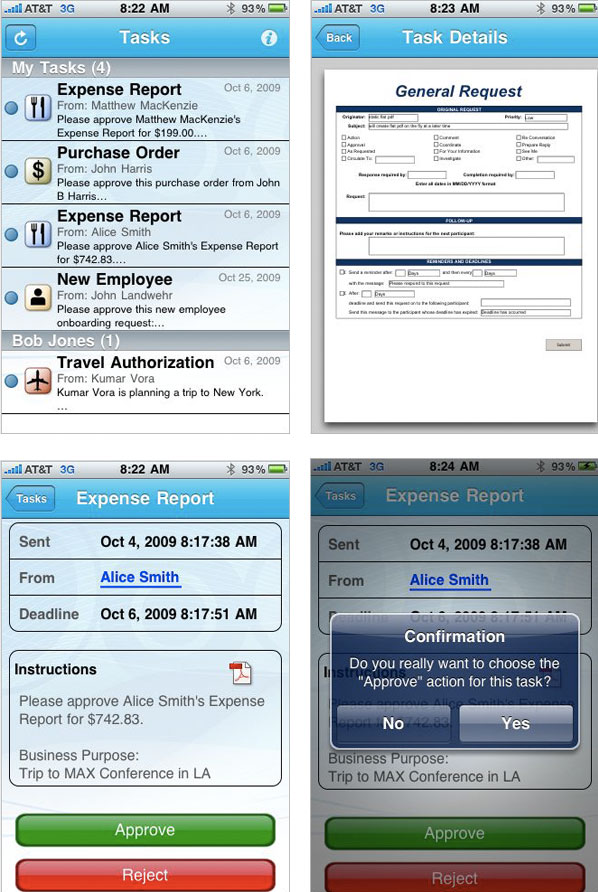 Sfruttando l’applicazione per iPhone i responsabili di un’azienda possono approvare note spese, l’acquisto di biglietti di viaggio, richieste di assunzione, ordini di acquisto, fatture, mutui e così via mentre si è in viaggio. E’ possibile visualizzare documenti PDF collegati ad un task, chiamate, email e condividere task con altri colleghi. Nel suo blog, John Nack, product manager di Adobe, ha scritto che “ora che il ghiaccio è rotto saranno presto disponibili altre applicazioni”.