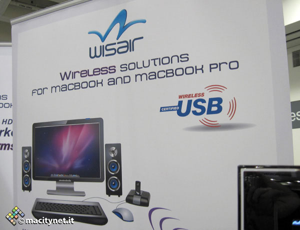 La californiana Wisair ha annunciato Wireless USB DisplayDock Set, un dispositivo per MacBook che sarà  offerto da vari OEM per la fine di marzo 2010 (in Europa il prodotto sarà  distribuito da Olidata), mostrato in anteprima nel corso del MacWorld 2010 di San Francisco e che consente di connettere i MacBook, senza usare fili, in un a monitor, casse, tastiere, mouse, il tutto sfruttando un singolo adattatore connesso ad una porta USB del computer. I MacBook non hanno di serie un connettore VGA o DVI (due connessioni molto usate dove sono presenti macchine desktop) e molti utenti di questi modelli di notebook hanno la necessità  di portare appresso fino a 4 cavi: da mini-Displayport o mini-DVI a VGA o DVI, una prolunga USB per una tastiera, una prolunga USB per il mouse, altri cavi per collegare l’audio.