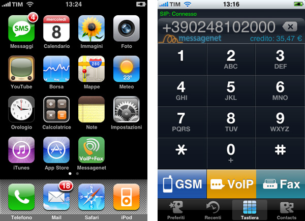 Per poter essere distribuito su App Store e funzionare su iPhone, il software Messagenet deve rispettare le scelte di Apple per quanto riguarda le funzioni e il sistema operativo dello smartphone. Così mentre su Symbian il programma rimane sempre in esecuzione in sottofondo, consumando poche risorse e batteria, su iPhone Messagenet si chiude una volta che l’utente preme il pulsante di ritorno alla dashboard. Ancora, Apple non permette che i programmi di comunicazione VoIP consentano all’utente di effettuare chiamate via Internet quando lo smarphone si trova sotto copertura dati cellulare. Una volta lanciato sul tascabile della Mela Messagenet presenta all’utente una schermata quasi del tutto identica a quella de tastierino telefonico integrato di serie da Apple. Le uniche differenze si trovano in basso: tre grandi pulsanti che permettono di scegliere al volo se lanciare una chiamata via rete GSM, tramite VoIP infine di inviare un Fax.