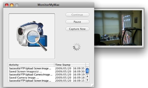 MonitorMymac è un’applicazione che cattura schermate a tempi preimpostati catturando eventualmente anche quanto ripreso dalla webcam. Le immagini possono essere memorizzate in locale oppure (via FTP) su un server via Internet. Il software è utile per controllare cosa succede o cosa si fa con il computer in nostra assenza ma anche come semplice sistema base per tenere sott’occhio uccellini e altri animali domestici visibili dalla webcam. La qualità  e dimensione delle immagini è definibile dall’utente. Le immagini, inoltre, possono essere salvate come filmati QuickTime.
