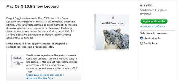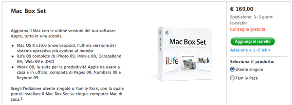 Questo allungamento dei tempi per la spedizione di Snow Leopard vale per la versione aggiornamento da 29 euro, per il Mac Box Set da 169 euro e anche per i rispettivi Family Pack: da 49 euro per l’installazione dell’aggiornamento su 5 Mac diversi e da 229 euro per il Family Pack del Mac Box Set che contiene oltre a Snow Leopard anche iLife e iWork ’09.