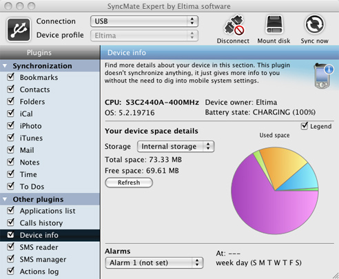 Con la versione gratuita SyncMate Free Edition è possibile sincronizzare i Contatti e gli impegni memorizzati iCal, inoltre il software permette di visualizzare informazioni dettagliate sul dispositivo Windows Mobile collegato al Mac, come per esempio lo stato della batteria, dettagli hardware e anche l’utilizzo della memoria, che in Windows Mobile è utile per individuare i programmi in esecuzione che non utilizziamo e che è possibile chiudere per migliorare le prestazioni.