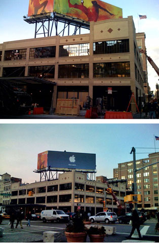 Da notare nella foto più in basso, scattata da più distante, l’enorme cartellone pubblicitario collocato sul tetto che potrebbe essere utilizzato per dare visibilità ai prodotti di più recente lancio o alle campagne di marketing di Apple. Da notare anche il fatto che le nostre due immagini, quella sopra e quella sotto, scattate ad un’ora l’una dall’altra (alle quattro e alle cinque del pomeriggio di ieri), presentano due pubblicità diverse. In una si vedono due silhouette iTunes, nell’altra c’è già il cartellone “Now Open” (ora aperto). Nella foto più sotto si intravede anche l’addetto alla collocazione del cartellone che sta terminando il suo lavoro.