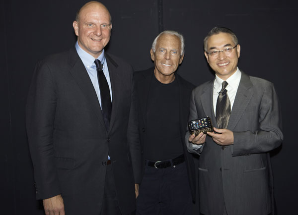 Giorgio Armani, Samsung Electronics e Microsoft hanno presentato un nuovo smartphone firmato Armani-Samsung, La casa dello stilista e imprenditore italiano (presente alla “vernice” del telefono con Steve Ballmer e Won Pyo Hong, Vice President Samsung Mobile), non è nuova nel settore del design per il mondo della telefonia: nel 2007 firmò un primo telefono e un modello denominato “Nigh Effect” lo scorso anno.
