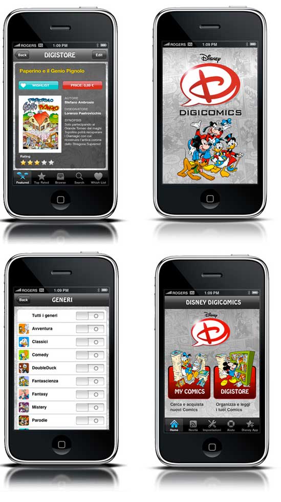 Ma come funziona? Il processo è semplicissimo, soprattutto per chi utilizza abitualmente i supporti per i quali Digicomics è stato creato. Su iPhone e iPod Touch, ad esempio, il lettore dovrà scaricare innanzitutto il Disney Digicomics Player sul suo device; accedendo alla sezione Digistore potrà scegliere il fumetto da scaricare (attraverso diverse maschere di ricerca: per titolo, personaggio, genere, etc.); e infine potrà eseguire il download della storia con un semplice clic, sfruttando le modalità di pagamento consentite dall’ambiente nel quale si trova. Il Digicomics Player permette, ovviamente, anche di organizzare l’archivio delle storie comprate in Playlist personali (divise per personaggio o per tipologia, proprio come accade con la musica) per rileggerle ogni volta che si desidera.