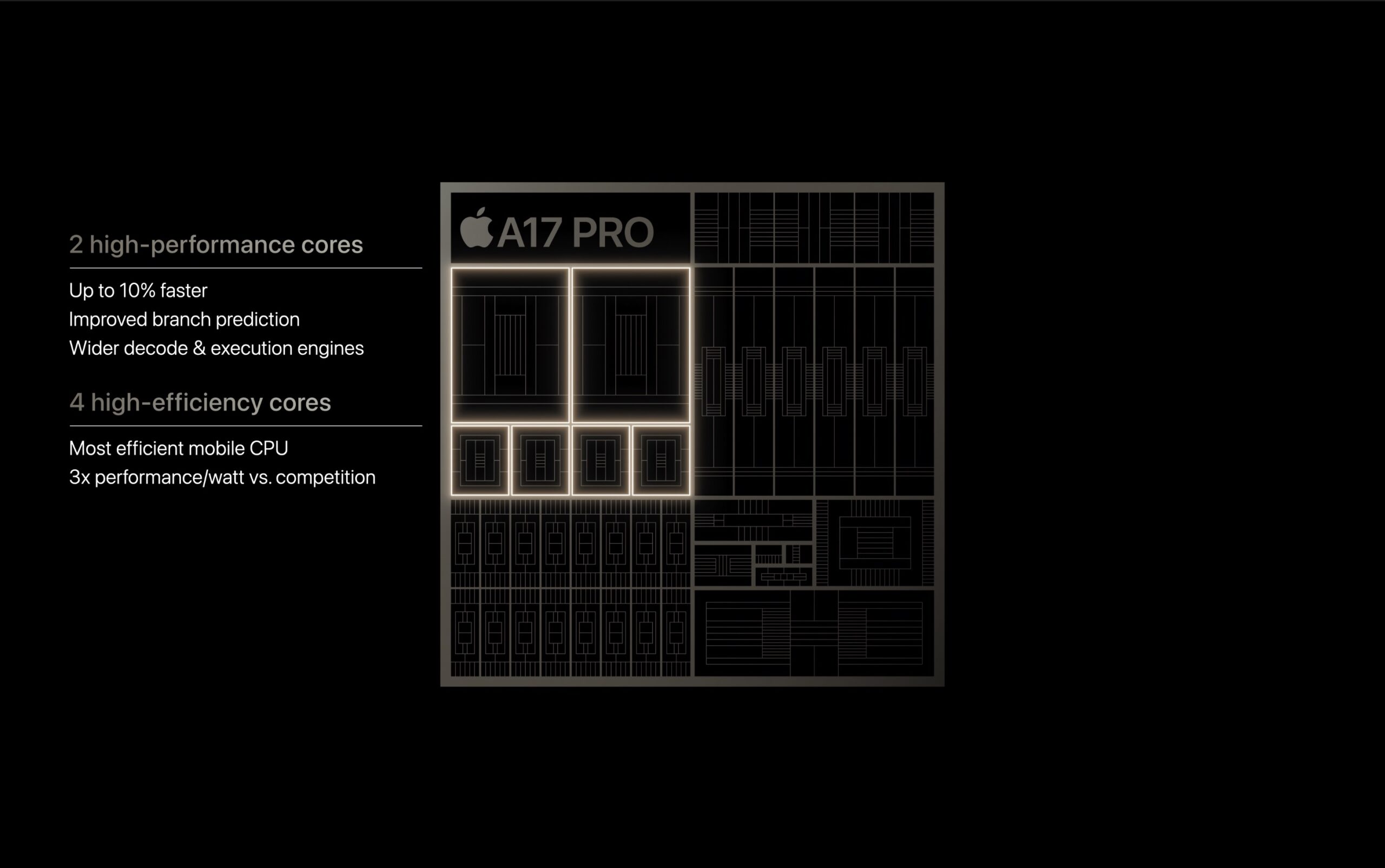 Il chip A17 Pro vanta CPU 6-core con 2 performance core e 4 efficiency core