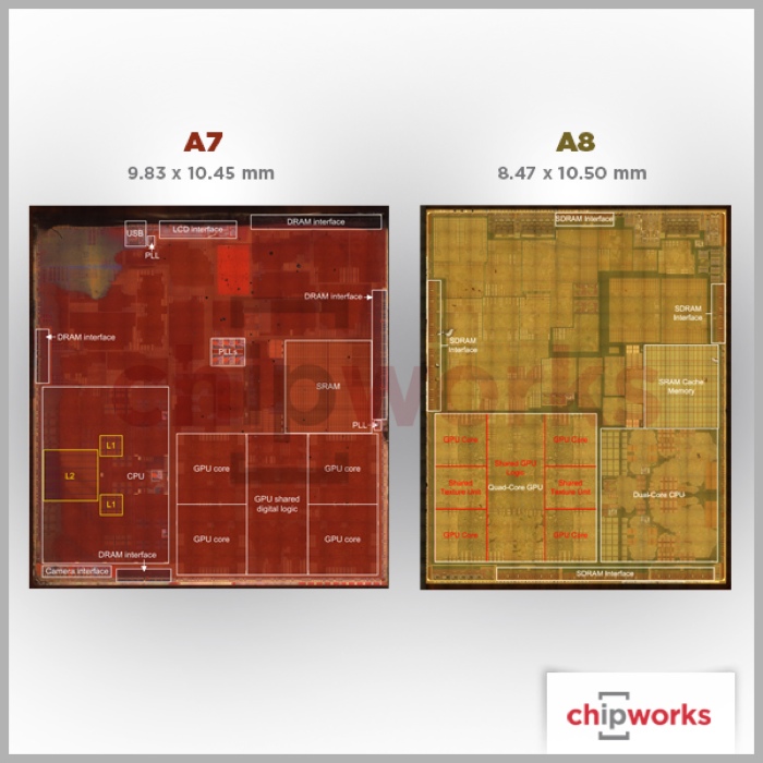 Grazie al nuovo processo costruttivo a 20 nanometri di TSMC, gli esperti rilevano che Apple avrebbe potuto ridurre le dimensioni complessive di Apple A8 fino al 50%, praticamente la metà, rispetto al precedente Apple A7 mantenendo invariate naturalmente tutte le specifiche precedenti. Questo però non è avvenuto: il nuovo Apple A8 è solo del 15% più piccolo rispetto ad A7, una quantità di spazio molto prezioso che gli ingegneri di Apple hanno sfruttato fino all’ultimo micron per migliorare e potenziare il processore.
