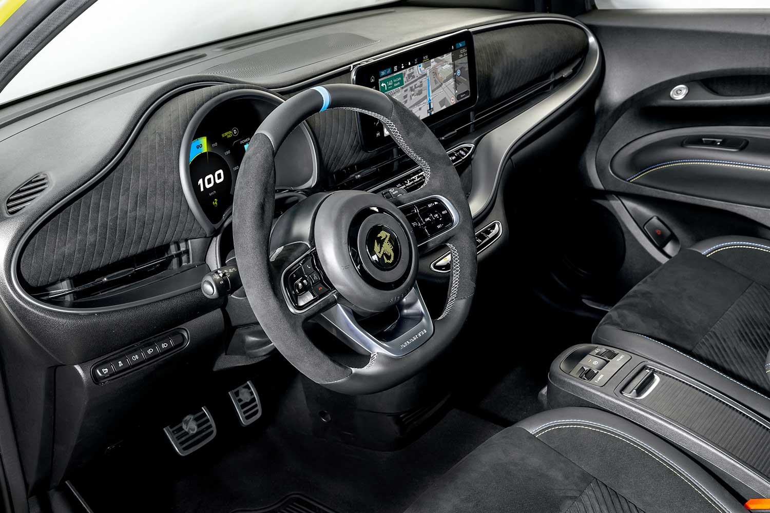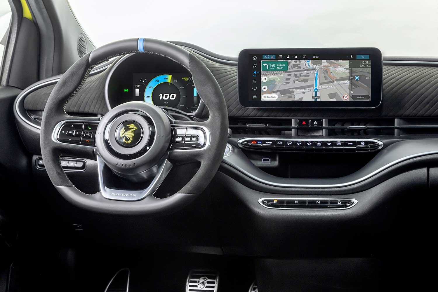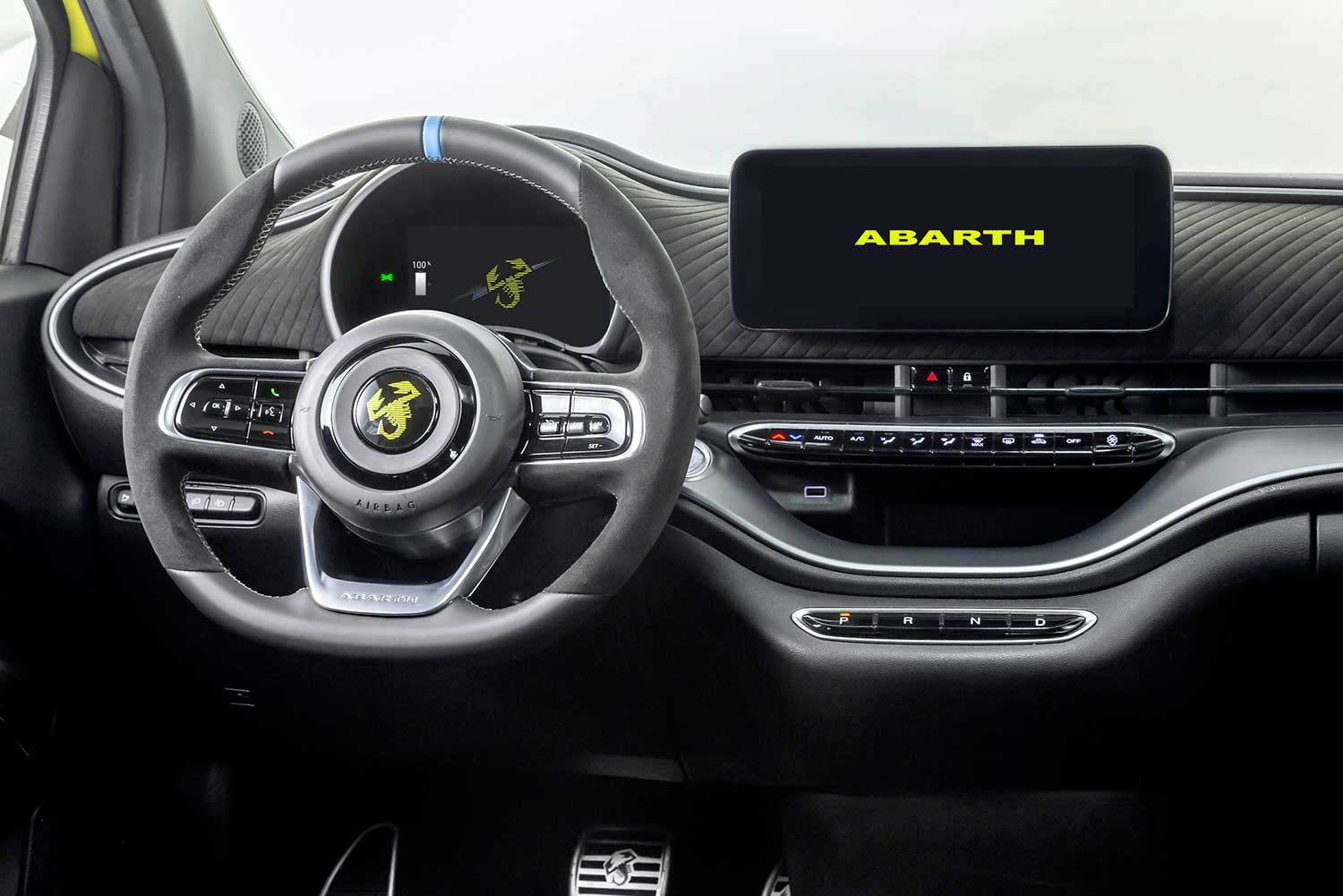 La vettura può essere equipaggiata con il Sound Generator, per chi non vuole rinunciare alla firma del marchio: l’inconfondibile “ruggito” Abarth, riproducendo fedelmente il suono di un motore Abarth a benzina. Il Sound Generator è offerto come alternativa all’esperienza sonora standard ed è dotato di un AVAS che richiama il suono di un motore a benzina – diverso dal fruscio standardizzato con la strimpellata della chitarra. Quando la vettura è equipaggiata con il Sound Generator, il sistema Key On-Off continua a riprodurre il suono di una chitarra all’interno dell’abitacolo a ogni accensione o spegnimento. Il Sound Generator può essere acceso o spento a piacere quando l’auto è ferma.