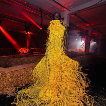 L’abito è realizzato con una serie di materiali come cavi internet, dadi e bulloni metallici, provenienti direttamente da data center. Il vestito sfrutta l’approccio unico di Raynor alle creazioni tessili e ai materiali insoliti, come già dimostrato nel vestire una serie di volti, tra cui Chappell Roan, Ellie Goulding e Rita Ora.
