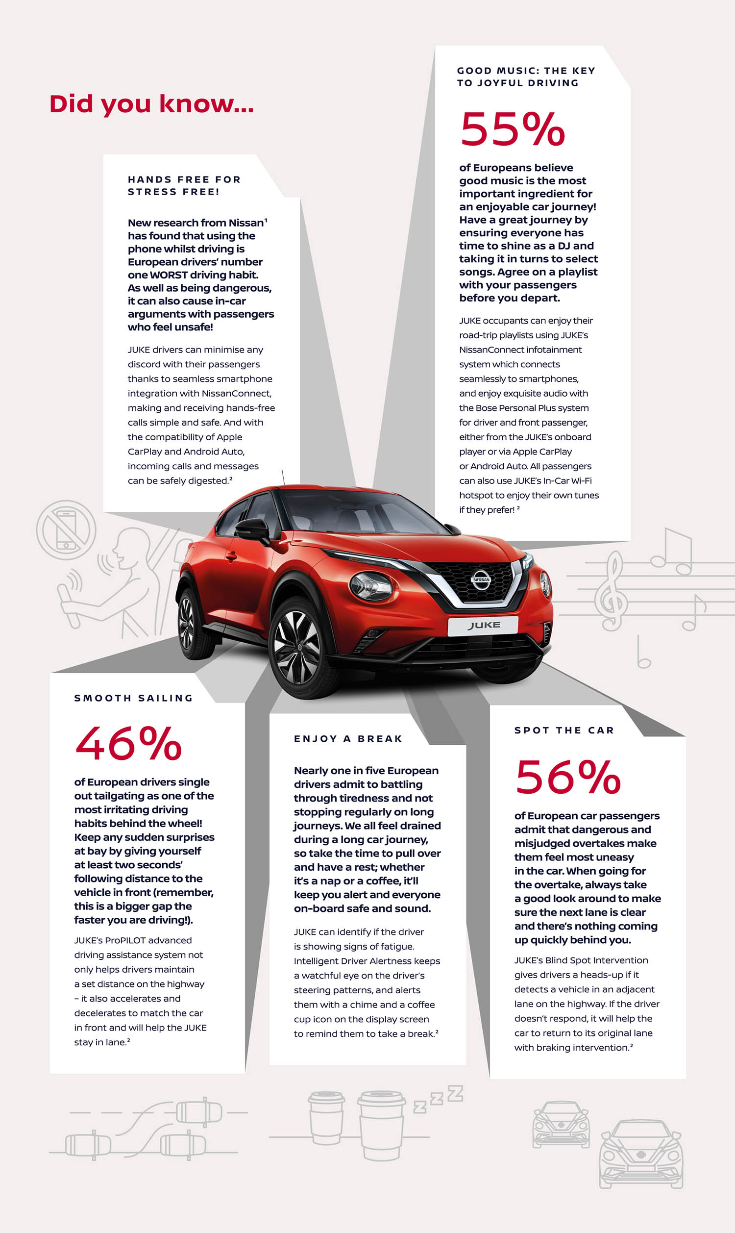 La ricerca ha evidenziato anche gli aspetti ritenuti più importanti dagli automobilisti per viaggiare tranquilli e senza stress. Guida sicura (59%) e buona musica (55%) sono citati come elementi irrinunciabili per una piacevole esperienze a bordo. Il 50% di guidatori e passeggeri europei attribuisce un ruolo prioritario alla musica per il buon umore, mentre per il 32% è fondamentale concordare a priori una playlist, superando per importanza anche la ricerca di un parcheggio comodo (24%). Emergono anche elementi relativi alle comodità a bordo, ecco che sedili confortevoli sono importanti per il 62% degli intervistati, seguiti da un abitacolo spazioso per il 43%.