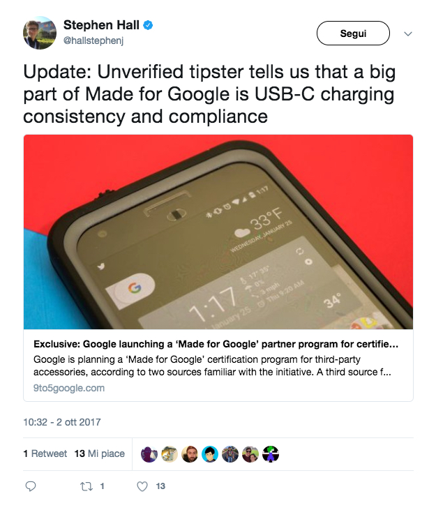 A poche ore dalla presentazione dei nuovi Pixel 2017 di Google, il sito 9to5Google svela in anticipo un nuova iniziativa che potrebbe essere annunciata durante l’evento: un programma di certificazione per gli accessori di terze parti dedicati ai dispositivi Google, chiamato “Made for Google”.