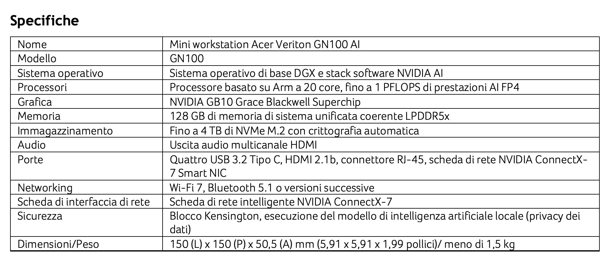 L’idea che l’intelligenza artificiale “seria” debba vivere forzatamente nel cloud ha i giorni contati. Con Acer Veriton GN100, un parallelepipede da 150 × 150 × 50,5 mm sotto il chilo e mezzo di peso, la potenza che finora associavamo ai rack dei data center scende di scala e si appoggia sul piano della scrivania. La chiave è tutta in quel nome: NVIDIA GB10 Grace Blackwell, il superchip che unisce CPU e GPU in un’unica architettura con memoria unificata e un traguardo simbolico (e pratico): fino a 1 PFLOPS di prestazioni AI in FP4.
