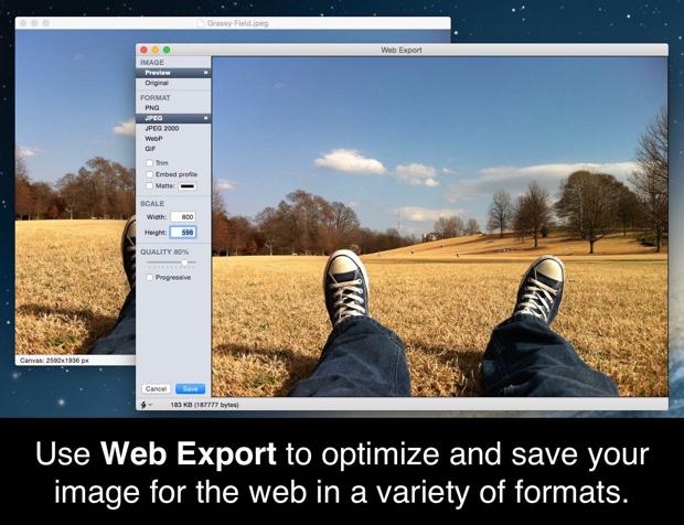 L’applicazione permette di esportare i file ottimizzandoli per il web e offre nuove funzionalità per l’importazione di file Photoshop (PSD) con o senza layer. L’app è scrivibile con AppleScript e funzionalità di automazione possono essere attivate sfruttando Automator o JavaScript. È anche possibile scrivere plug-in dedicati usando un linguaggio di scripting come Python, JavaScript o Objective-C.