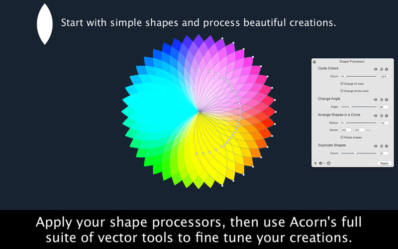 A un anno di distanza dalla precedente release, gli sviluppatori di Flying Meat hanno rilasciato la versione 5 dell’editor di immagini Acorn. Come sempre varie e molto corpose le novità integrate (qui l’elenco completo). Una delle principali novità è la funzione Shape Processor: un insieme di fitri non distruttivi che permettono di applicare effetti con modalità di blending (fusione) di vario tipo. Una funzione denominata “Processor” permette di raccogliere forme in raccolta quali cerchi, spirali o a caso sul canvas.