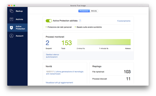 Acronis True Image 2018 for Mac offre funzioni di backup e ripristino potenziate, un’interfaccia aggiornata secondo lo stile macOS e il supporto della Touch Bar. Il software include anche Acronis Active Protection, tecnologia che secondo gli sviluppatori consente di proteggersi contro potenziali ransomware, un sistema adatto per utenti privati, famiglie, sino a home office e a piccole aziende.