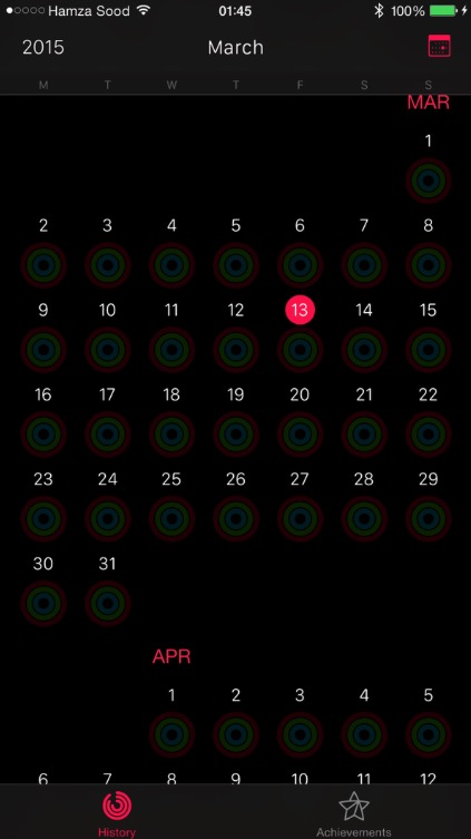 Sotto forma di anelli, proprio come nell’applicazione dell’orologio, sono raggruppate tutte le attività quali passi, distanza percorsa ed esercizio fisico raggruppabili per giorno, mese o anno. All’interno di una scheda sono raccolti diversi Achievements, ovvero le medaglie che saranno assegnate all’utente ogni volta che avrà raggiunto un determinato traguardo con lo scopo di premiare l’impegno e motivare per conquistarne di nuove con del sano esercizio fisico.