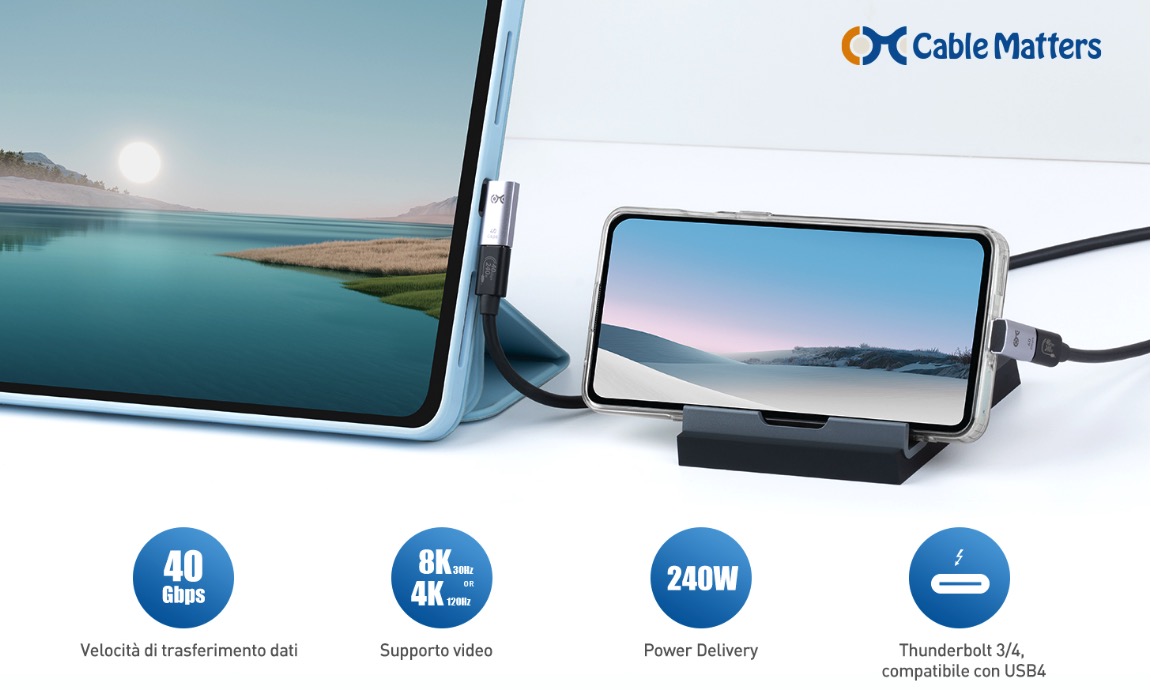 Per acquistarle gli adattatori angolari Cable Matters a 10,99€ potete partire da qui. Se vi servisse un cavo Cable Matters, anche questo di sicura qualità, da 40 Gbps partite da qui. Oppure se vi serve da 10 Gbps (massima velocità di un iPhone) potete comprare questo.