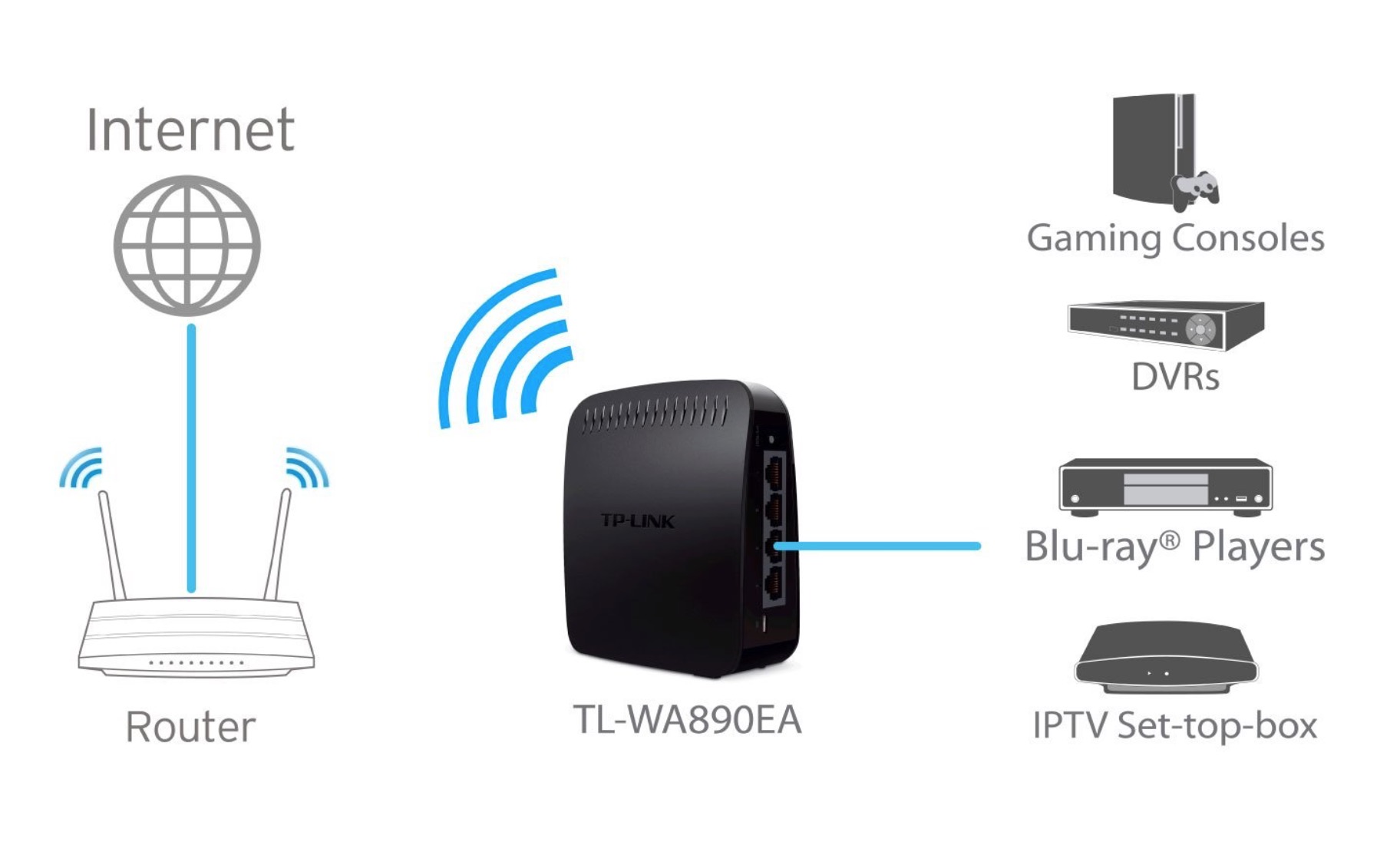 Oltre a SmartTV potrete quindi connettere ad Internet anche decoder, console di gioco, stampanti, lettori Blu-Ray, MySky HD e qualsiasi altra periferica del genere eliminando tutti i cavi, antiestetici ed ingombranti, senza alcun impatto sulle performance. La velocità di collegamento wireless raggiunge fino a 300Mbps a 2.4GHz o 5GHz, quindi è l’ideale anche per streaming HD di video, musica e giochi online. È possibile premere i pulsanti “WPS” sul router e sull’Entertainment Adapter per instaurare automaticamente una connessione Wi-Fi protetta tra i due dispositivi. Se avete un prodotto non compatibile WPS sarà possibile collegare via Ethernet il TL-WA890EA ad un computer e poi configurare la rete.