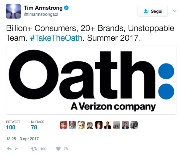Yahoo inizialmente aveva rifiutato di commentare la possibilità di modificare il suo brand in Oath; AOL, tuttavia, ha rilasciato una breve dichiarazione prima del tweet di Armstrong dicendo: “Nell’estate del 2017, potete scommettere che lanceremo una delle aziende con il brand più dirompente in campo digitale.” Da questi indizi si può dunque pensare che l’annuncio ufficiale di Oath possa avvenire a breve, nelle prossime settimane.