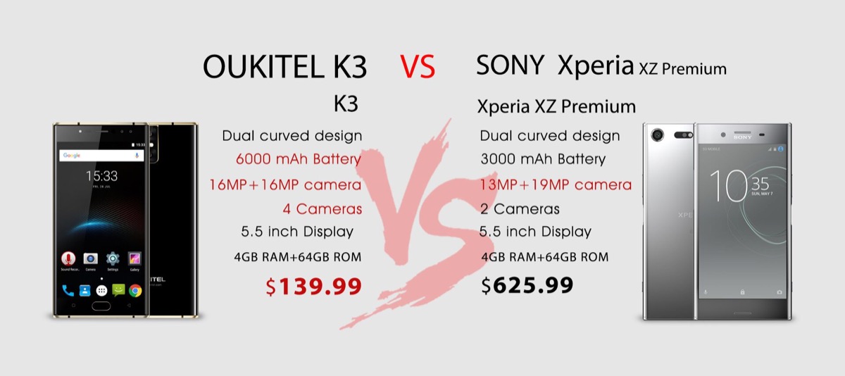 Dove vince poi Oukitel K3 è sul prezzo: mentre Sony Xperia XZ Premium costa 625,99 dollari, Oukitel K3 si acquista per 179,99 dollari, nonostante entrambi montino poi 4 GB di RAM. Attualmente, grazie all’offerta attiva sul sito ufficiale, costa ancora meno: solo 139,99 dollari.