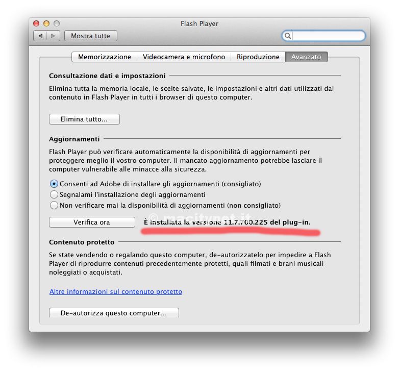 Se avete una versione recente di Flash Player per OS X è possibile controllare la presenza di nuovi update selezionando dalle Preferenze di Sistema la voce “Flash Player” e da qui facendo click su “Verifica Ora” nella sezione “Avanzato”. In alternativa è possibile scaricare da zero il pacchetto con Flash Player da questo indirizzo del sito Adobe (sono 17,1 MB). Anche per gli utenti della versione 10.x del player è disponibile un update. Il supporto a quest’ultima versione cesserà dal 9 luglio di quest’anno.