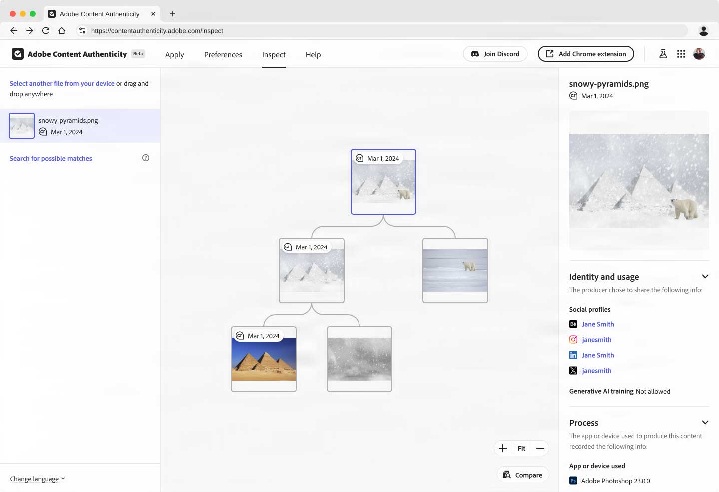 Una filigrana digitale (una icona con la dicitura “CR”) permetterà di rivelare i metadati associati; sarà ovviamente necessario che il sito che ospita questo tipo di immagini sia in grado di tenere conto della marcatura (tra le prime aziende che hanno annunciato il supporto a questo tipo di file ci sono Linkedin e Meta). Adobe offre intanto una un’estensione per Chrome che rivela automaticamente la presenza di una Content Credential su un’immagine. Non manca un sito web per fare manualmente la verifica di i file salvati sul proprio computer.