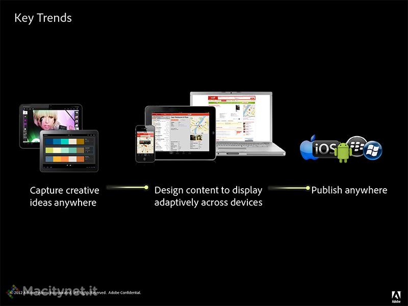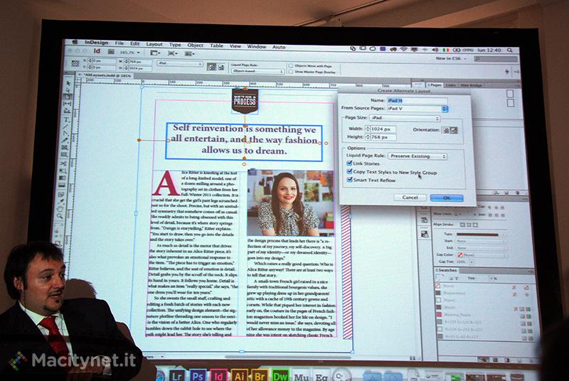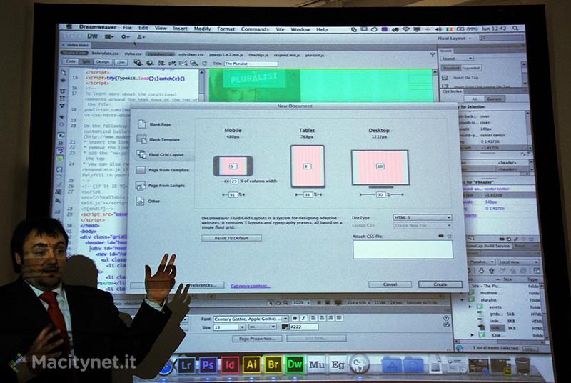 A presentare la nuova Adobe Creative Suite 6 si sono alternati il Country Manager italiano Roberto Caffarone, l’EMEA Marketing Manager Paul Van Keeken e i solution Consultant Alberto Comper per la sezione video e Matteo Oriani per la sezione immagini. Tutti nelle loro strutturate relazioni, hanno puntato a mettere in luce lo sforzo che continua da anni: costruire una «cassetta degli attrezzi» per la produzione di media digitali a tutto tondo, comprendendo sia i mezzi tradizionali e business core di Adobe per decenni, sia abbracciando i nuovi strumenti dell’era digitali quali i dispositivi mobili e le soluzioni basate sul cloud.