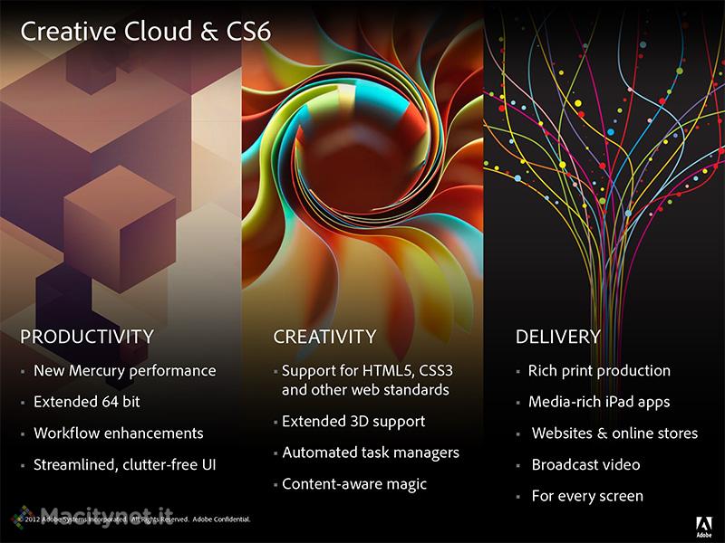 I prodotti Adobe Creative Suite 6 e la piattaforma Adobe Creative Cloud saranno disponibili in lingua italiana entro metaÌ maggio e possono essere prenotati fin d’ora. L’abbonamento ad Adobe Creative Cloud saraÌ disponibile per i clienti di 36 paesi e in piuÌ lingue. Il prezzo dell’abbonamento individuale eÌ di 49,99 euro al mese + IVA con contratto annuale e di 74,99 euro al mese + IVA per l’abbonamento mensile.
