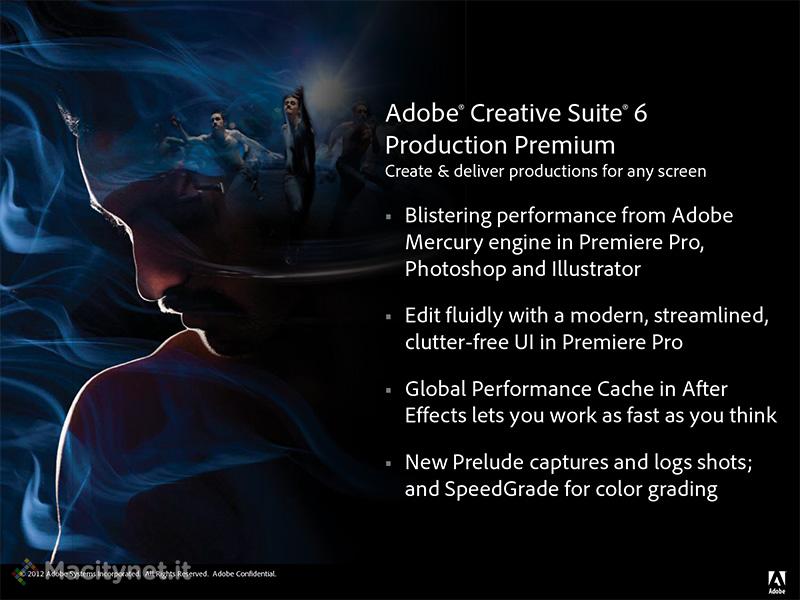Adobe continua ad offrire i 14 software singoli e le Creative Suite: Adobe Creative Suite 6 Design e Web Premium (2.199 euro + IVA); Adobe Creative Suite 6 Design Standard (1.499 euro + IVA). Adobe Creative Suite Production Premium (2.199 euro + IVA) e Adobe Creative Suite Master Collection (2999 euro + IVA). Per maggiori informazioni sulle caratteristiche, le politiche, i prezzi, i costi di aggiornamento e le versioni internazionali, visitare il sito www.adobe.com/prductscreativesuite/html