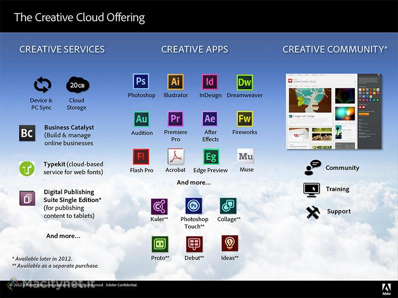 Ma la più grande novità per quanto riguarda la distribuzione dei programmi è l’attivazione del Cloud di Adobe. Tramite una iscrizione a pagamento a base mensile è possibile accedere a uno Store personale e punto di contatto tra la software house e il cliente. Tramite il Cloud sarà possibile scaricare le versioni complete e funzionanti di diversi programmi della CS6 (cui se ne aggiungeranno altri in futuro), accedere alla Community per ricevere supporto e corsi di apprendimento, attivare la sincronizzazione tra computer e dispositivi mobili dei propri lavori e avere a disposizione uno spazio di archiviazione di 20 GB; inoltre si aggiungono servizi indirizzati al miglioramento della produttività come Business Catalyst (per la gestione della propria attività online), Typekit (un servizio di web font basato sul web per arricchire i propri siti con font di qualità) e Digital Publishing Suite Single Edition (per la pubblicazione dei contenuti sui tablet).